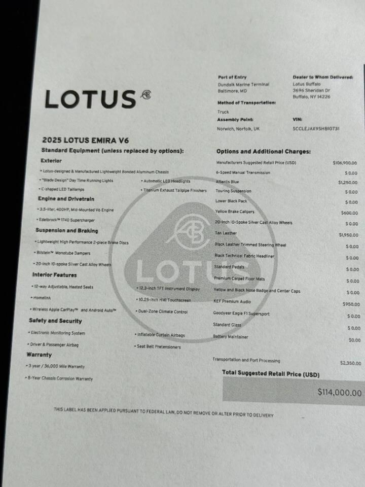 New Just arrived 2025 Lotus Emira in Osmium silver and lower black pack - six speed manual V6! 2 miles - Beautiful package and color combination. Window sticker attached and one of 3 last ones to arrive for this year! for further information contact Lotus WNY at 716 863 2537